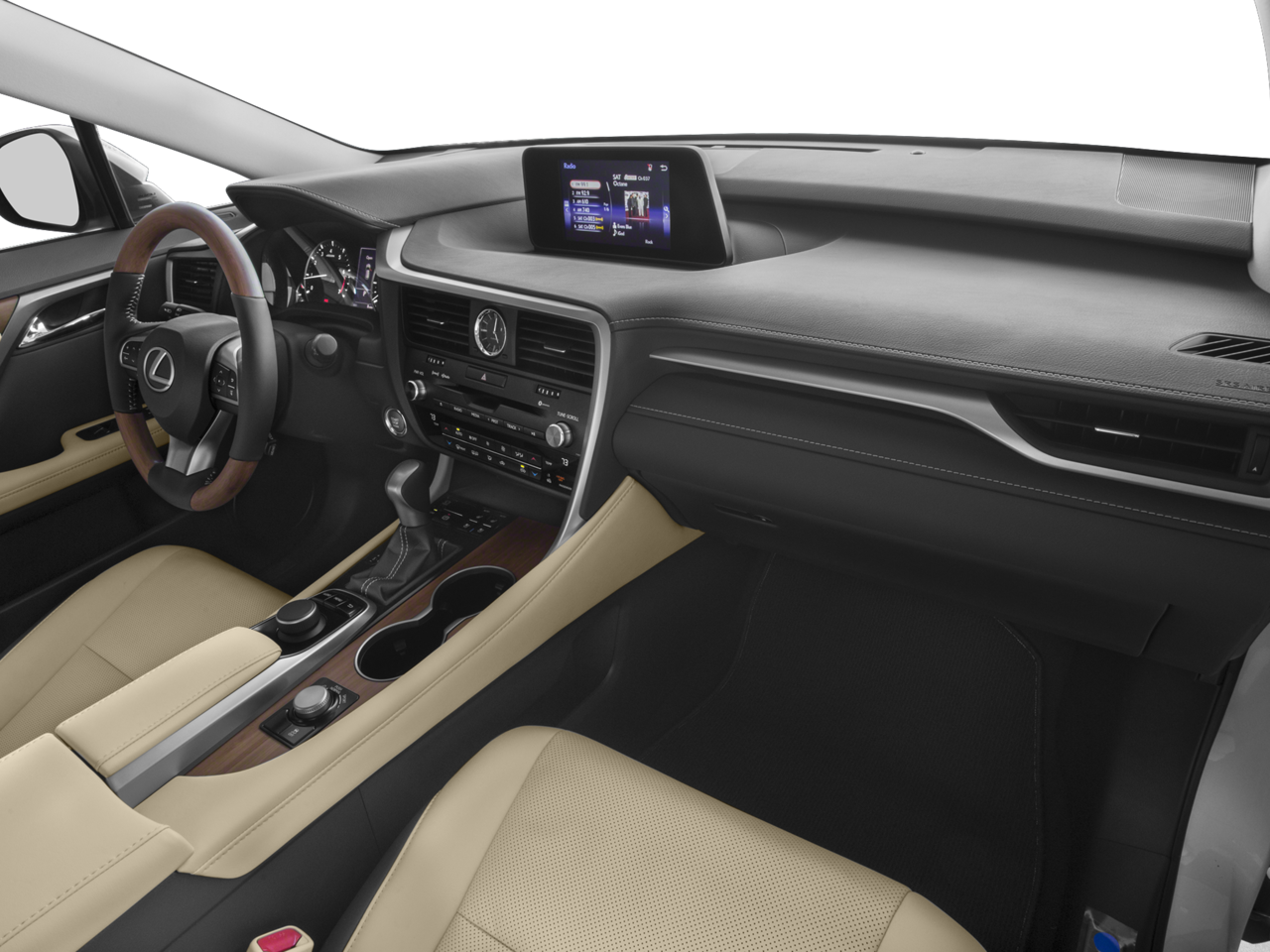 12.3 NAVIGATION SYSTEM advanced voice command casual-language voice recognition system, remote touch navigation controller, HD Radio w/iTunes tagging, SiriusXM NavTraffic, NavWeather, Sports, Stocks and Fuel Prices and Electro Multi Vision (EMV) display, Lexus Enform Destination Assist, Lexus Enform App Suite, destination search, Yelp, iHeartRadio, Facebook Places, Movietickets.com, OpenTable, Pandora, Slacker, stocks, fuel prices and sports, Single-Disc DVD Changer, POWER TILT & SLIDE MOONROOF roof rail, PREMIUM PACKAGE walnut without illumination door trim, Rear Armrest Storage Compartment, Driver Seat Memory w/3 Settings, drivers seat Easy Exit (auto away/return), Steering Wheel Memory, Power Folding Electrochromic Mirror w/Memory, power fold and memory, BLIND SPOT MONITOR W/REAR CROSS TRAFFIC ALERT intelligence clearance and back sonar and lane change assist, HEATED & VENTILATED FRONT SEATS, ACCESSORY PACKAGE Key Gloves, Alloy Wheel Locks, Carpet Cargo Mat, Cargo Net, TOUCH-FREE POWER REAR DOOR, HEATED LEATHER STEERING WHEEL. Lexus RX 350 with Atomic Silver exterior and BLACK interior features a V6 Cylinder Engine with 295 HP at 6300 RPM*.
